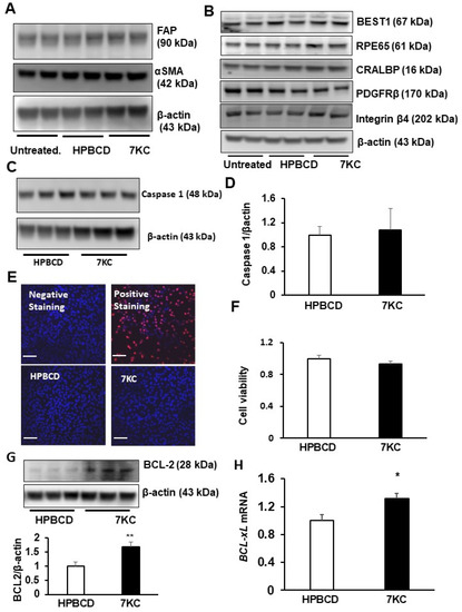 We previously found that CECs underwent endothelial-mesenchymal transition after exposure to 7KC and that intravitreal 7KC increased fibrosis in laser-induced lesions in vivo [15]. To determine if 7KC led to EMT of other cells, including RPE, we measured mesenchymal cell markers, fibroblast activation protein (FAP), and alpha-smooth muscle actin (αSMA), in western blots in HPBCD- or 7KC-treated hRPE after 48 h of exposure. Following treatment, 7KC did not increase FAP or αSMA compared to HPBCD in hRPE (Figure 1A). In the same cell lysates, RPE-specific proteins, BEST1, RPE65, CRALBP, PDGFRβ, and integrin β4 [18] were not affected by 7KC treatment (Figure 1B). Together, these data suggest 7KC does not induce EMT of the RPE at the same concentration and exposure times. 7KC induces several pathophysiological effects, including inflammation, oxidative stress, and cell death [5]. To determine if 7KC led to caspase-mediated RPE death, caspase 1 and caspase 3 were measured in 7KC- or HPBCD-treated hRPE. After exposure to either treatment, cleaved caspase 3 (Supplementary Figure S1) was not detected. Neither total caspase 3 (Supplementary Figure S1) nor caspase 1 (Figure 1C,D) was increased after 7KC treatment. Furthermore, 7KC did not induce hRPE death determined by the number of TUNEL-positive cells (Figure 1E) or by the tetrazolium bromide (MTT) assay (Figure 1F), providing support that the concentration of 7KC used was not cytotoxic to hRPE. Rather, 7KC significantly increased the anti-apoptotic protein BCL-2 (Figure 1G) and the mRNA expression of BCL-xL (Figure 1H), which suggested that 7KC-treated hRPE exhibited an anti-apoptotic phenotype.