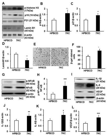 7-ketocholesterol (7KC) induces RPE cell cycle arrest at mitosis, senescence and senescence associated secretory phenotype (SASP). Western blots of (A) of phospho-Histone H3 (Ser10), (A–D) p16, p21 and LaminB1; (E,F) β-galactosidase (β-gal) (the scale of bars: 100 µm); western blots of (G,H) phosphorylation of NF-κB (p-NF-κB), total NF-κB, (I,J) IL-1β, (I,K) IL-6 and (I,L) VEGF in HRPE cells treated with HPBCD or 7KC for 48 h (* p < 0.05, ** p < 0.01, *** p < 0.001 vs. HPBCD; (A,E,G,I): representative images; (B–D,F,H,J–L): quantification results; n = 4–6).