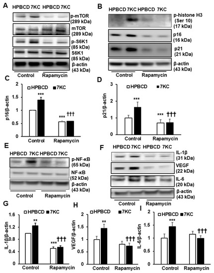 Inhibition of mTOR signaling inhibits 7-ketocholesterol mediated RPE senescence and SASP. Western blots of (A) phosphorylation of mTOR (p-mTOR), total mTOR, phosphorylation of S6K1 (p-S6K1), total S6K1, (B) phospho-Histone H3 (Ser10), (B,C) p16, (B,D) p21, (E) phospho-NF-κB (p-NF-κB) and total NF-κB, (F,G) IL-1β, (F,H) VEGF and (F,I) IL-6 in hRPE pretreated with Control or Rapamycin (10 nM) for 30 min prior to incubation with HPBCD or 7KC for 48 h (** p < 0.01 and *** p < 0.001 vs. HPBCD of Control; ††† p < 0.001 vs. 7KC of Control; n = 4–6).