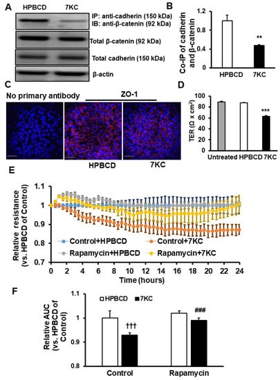 To determine if 7KC-treated hRPE had reduced barrier resistance, the barrier integrity of hRPE was measured. Barrier structure was measured as the interactions between the adherence junction protein, cadherin, and β-catenin using co-immunoprecipitation (Co-IP) and by immunohistochemical labeling of junctional protein, ZO-1, in cell monolayers. Barrier function was measured using transepithelial resistance (TER) or cell impedance using electrical cell-substrate impedance sensing (ECIS). Compared to HPBCD, Co-IP of cadherin and β-catenin was significantly decreased in 7KC-treated hRPE without affecting the total cadherin and β-catenin concentrations (Figure 4A,B). The junctional integrity of the monolayer of the hRPE, assessed by immunolabeling for ZO-1, demonstrated intact cell-cell junctions in HPBCD-treated hRPE but disrupted junctions in 7KC-treated hRPE (Figure 4C), further supporting the idea that 7KC reduces RPE barrier integrity. To determine the effect of 7KC on barrier function, hRPE barrier resistance was measured by TER after 7KC and found to be significantly reduced compared to either untreated- or HPBCD-treated cells (Figure 4D). These findings were corroborated by ECIS in which 7KC treatment significantly reduced cell impedance compared to HPBCD treatment and pretreatment with rapamycin improved cell impedance in 7KC-treated hRPE as measured by ECIS (Figure 4E,F).