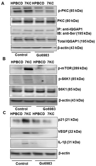 We previously found that serine phosphorylation of the multidomain protein, IQGAP1, was involved in TNFα-mediated RPE barrier compromise [25]. Therefore, we were interested in investigating whether IQGAP1 phosphorylation was involved in 7KC-mediated RPE changes, including 7KC-induced senescence. Since IQGAP1 phosphorylation is regulated by protein kinase C (PKC) [26], a series of experiments were performed in the hRPE pretreated with a pan PKC inhibitor, Go6983, prior to incubation with 7KC or HPBCD. Compared to HPBCD, 7KC treatment induced phosphorylation of PKC and IQGAP1 serine phosphorylation, measured by immunoprecipitation (Figure 5A). Pretreatment with Go6983 partially inhibited 7KC-induced p-PKC (Figure 5A) but greatly reduced IQGAP1 serine phosphorylation, supporting the hypothesis that PKC activation was upstream of IQGAP1 phosphorylation. In a parallel experiment, p21, VEGF, IL-1β, p-mTOR, and p-S6K1 were measured in Go6983 or control pretreated hRPE. 7KC-mediated p-mTOR, p-S6k1, p21, VEGF, and IL-1β were reduced in Go6983-pretreated cells (Figure 5B,C). Taken together, the results in Figure 5 show that 7KC-mediated hRPE senescence involved PKC and serine phosphorylation of the multidomain protein, IQGAP1.