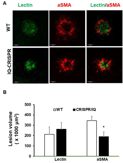 We previously reported that intravitreal injections of 7KC promoted fibrotic changes of laser-induced CNV [15]. Since 7KC induces serine phosphorylation of IQGAP1, we then tested the effect of IQGAP1 serine phosphorylation on 7KC-mediated fibrosis in laser-induced lesions in mice. The serine residues 1441 and 1443 have been identified as important phosphorylation sites on human IQGAP1 [26]. Therefore, the serine residue 1441 (murine analog) on IQGAP1 was targeted as an area of interest important in AMD and fibrosis. We generated mice that had a serine 1441 mutation using a CRISPR-gene editing approach (CRISPR/IQ mice). Two weeks after laser-induced injury and intravitreal 7KC injections, we measured lectin- and αSMA-stained lesions in CRISPR/IQ and littermate wildtype mice. As shown in Figure 6, volumes of lectin-stained lesions were not significantly different between 7KC-injected eyes of littermate wildtype and CRISPR/IQ mice. However, CRISPR/IQ mutant mice had reduced αSMA-stained lesions after 7KC injection compared to littermate control mice (Figure 6). Taken together, the results support the postulate that IQGAP1 phosphorylation was involved in pathophysiologic steps related to 7KC-mediated fibrosis.