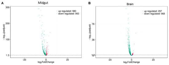 Volcano plot of the differential gene expression analysis between Normal Diet (ND) and Mix Diet (MD). (A) Midgut tissue showed 980 upregulated genes (red dots) and 993 downregulated genes (green dots). (B) The brain tissue showed 297 upregulated genes (red dots) and 968 downregulated genes (green dots). The blue dots represent those genes that did not show statistically significant differential expression.