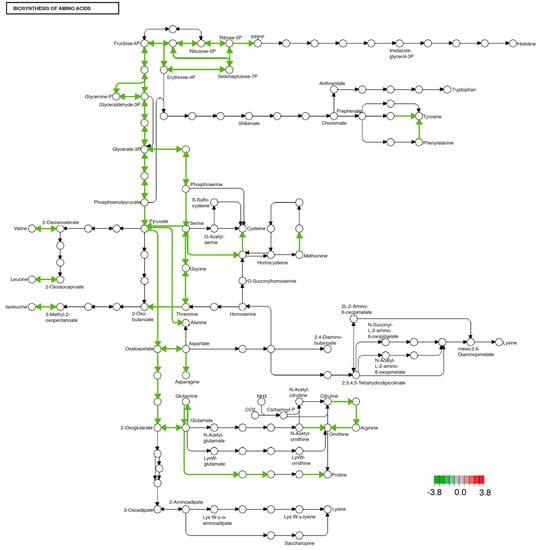 Significantly differentially expressed genes identified by KEGG in the biosynthesis of amino acids pathway. Green lines indicate significantly downregulated genes involved in this pathway. This pathway was identically modified in both midgut and brain tissues.