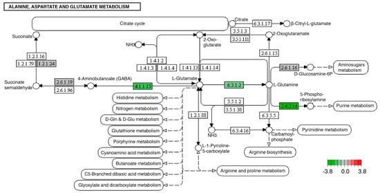 Significantly differentially expressed genes identified by KEGG in the alanine, aspartate, and glutamate metabolism pathways. Green boxes indicate significantly downregulated genes. This pathway was modified identically in both midgut and brain tissues.