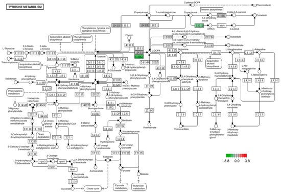 Significantly differentially expressed genes identified by KEGG in the tyrosine metabolism pathway. Green boxes indicate significantly downregulated genes. This pathway was identically modified in both midgut and brain tissues.