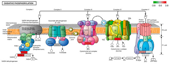 One of the biological processes with the highest number of modifications in the transcripts of its participating proteins was oxidative phosphorylation, which showed five transcripts with increased expression in overnourished larvae, compared to individuals fed with the ND. The modified products were NADH ubiquinone reductase (7.1.1.2), quinol-cytochrome-c reductase (7.1.1.8), and F1-ATPase (7.1.2.2) (Figure 5).
