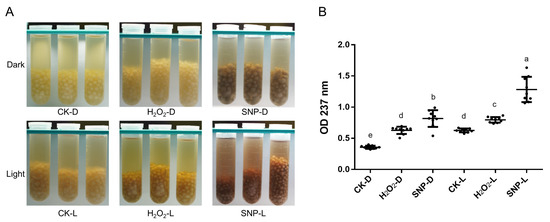 O. sinensis proliferated in the form of hyphal aggregates in OS1 medium. The hyphal aggregates were white in the dark, and the color of the culture medium did not appreciably change. The color of the hyphal aggregates and the culture medium considerably darkened under light-induced circumstances (Figure 1A). Similarly, the addition of H2O2 and SNP, which induce ROS and reactive nitrogen species (RNS) oxidative stress, could also stimulate the production of melanin. After the fermentation products under different conditions were extracted for melanin, the absorbance was measured at 237 nm. The results showed that the applying of RNS stress significantly promoted melanin yield (Figure 1B).