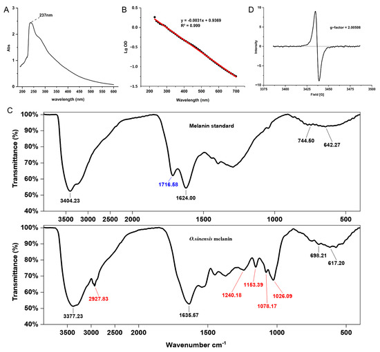 The UV-visible spectrum of O. sinensis melanin exhibited strong optical absorbance in the UV region, and the maximum absorption peak was observed at 237 nm (Figure 2A). In addition, the log of the optical density of O. sinensis melanin against its wavelengths produced a linear curve with a negative slope of −0.0031, which is consistent with the absorption characteristics of melanin (Figure 2B), indicating that the purity of the extracted melanin was high.