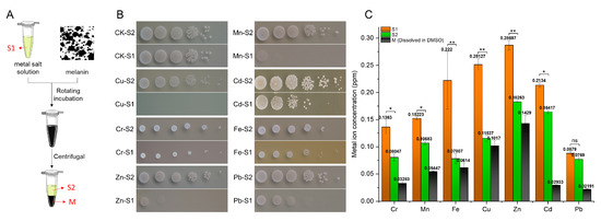 The metal-ion-chelating ability of O. sinensis melanin. (A) Schematic diagram of metal ion chelation experiment. (B) Inhibition effect of the metal solution on S. cerevisiae growth. (C) Concentration of metal ions in each component during the incubation experiment. Values represent the mean ± SD of three experiments; ANOVA was used to compare the concentration of metal ions in the solution of melanin before (S1) and after (S2) incubation. (* p < 0.05; ** p < 0.01; ns, no significant difference).