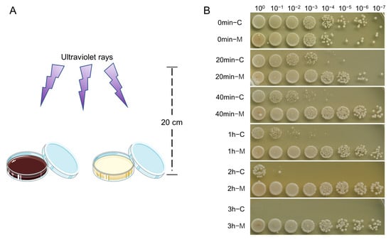 S. cerevisiae was cultured in a YPD medium to an OD600 = 1.0, and the cells were harvested via centrifugation at 700× g for 5 min, washed twice with sterile water, and resuspended in sterile water to an OD600 = 1.5. The yeast suspension was placed in a sterile culture dish, melanin (dissolved in DMSO) was added to the final concentration of 0.1 mg/mL, and an equal volume of DMSO was added as a control. The two groups of yeast were placed under UV light (F8T5GL-Z287 15w, Forbens, Guangzhou, China), irradiated for different times, subjected to 10 times gradient dilution, and then dripped onto a YPD plate medium. The plates were placed at 28 °C.