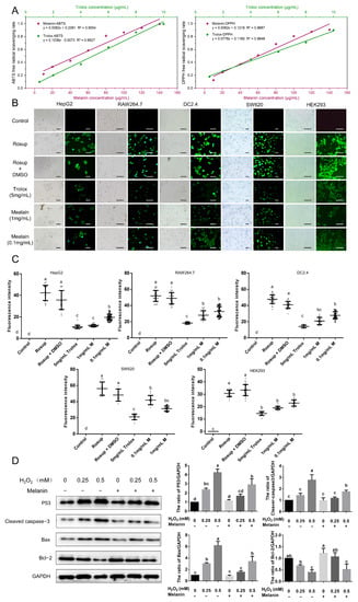 The intracellular ROS levels were measured using a ROS assay kit (Beyotime Biotechnology, Nantong, China). Briefly, the cells were inoculated into 24-well plates at 105 cells per well, and melanin, DMSO (solvent control), and Trolox (positive control) were added. After 6 h, 50 μg/mL Rosup was used to induce ROS. Following the treatment, the cells were incubated with DCFH-DA for 20 min at 37 °C and then observed using fluorescence microscopy (ZESS Axio Observer A1, Oberkochen, Germany). The relative fluorescence intensity was then calculated and analyzed using GraphPad Prism (version 6.01) for the t-test.