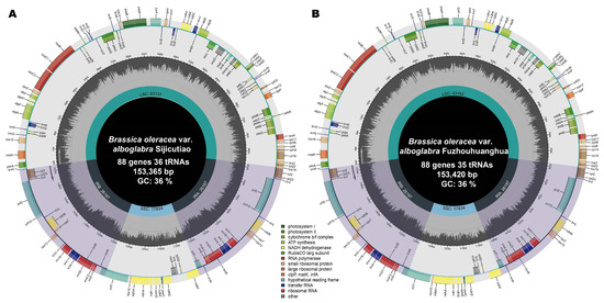The complete chloroplast genome maps of (A) B. oleracea var. alboglabra cv. Sijicutiao (SJCT) and (B) B. oleracea var. alboglabra cv. Fuzhouhuanghua (FZHH). The genes in the circle are transcribed clockwise, and the genes outside are transcribed counterclockwise. Genes are color-coded according to their roles. The G/C content of each gene is shown in the deep grey in the central circle and the A/T content is shown in lighter grey.