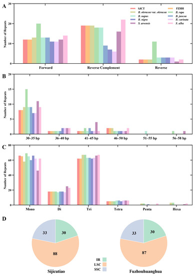 Dispersed repeated sequence analyses in 10 chloroplast genomes. (A) Number of three types of repeated sequences in 10 chloroplast genomes; (B) Number of dispersed repeated sequences with different period sizes; (C) Number of SSRs with different sizes; (D) Statistics of different SSR locations in SJCT and FZHH.