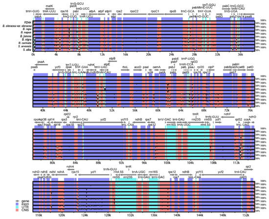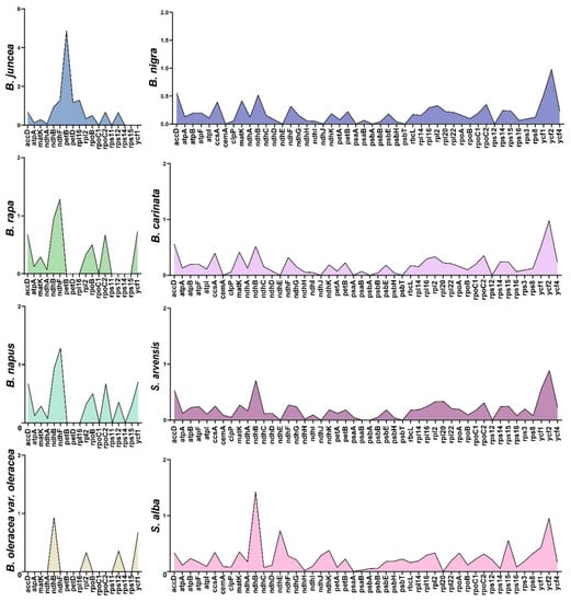 The complete chloroplast genomes of both Chinese kale variants, six Brassica, and two Sinapis were included in the comparative analysis. The Triangle of U describes a theory of the evolutionary relationships among six globally important Brassica species [17]. This theory posits that the combination of the Brassica genomes of three diploid plants formed three modern tetraploid vegetable and rape cultivars. According to the Triangle of U, B. nigra, B. oleracea, and B. rapa were diploid, and B. carinata, B. juncea, and B. napus were tetraploid. The tetraploid species were cultivated from two diploid species. The relationships between these species have been elucidated using various tools. B. carinata has been shown to be derived from interspecific hybridization between the diploid progenitors B. nigra and B. oleracea [18,19]. S. alba, also known as Brassica hirta, is a white-flowered or yellow-flowered annual plant in the family Brassicaceae [20]. Therefore, we included two Sinapis species in our comparative analysis in addition to the eight Brassica species.