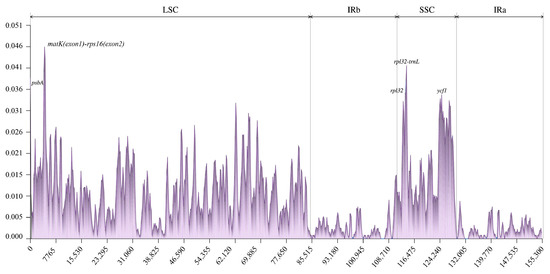 A comparison of the variation in the 10 chloroplast genomes using SJCT as a reference revealed a high degree of sequence similarity (Figure 4). This is consistent with the results of the mVISTA analysis, wherein the divergent hotspot regions indicated that the five mutational hotspots exhibited markedly higher π values. The matK-rps16 showed the highest average sequence divergence among the 10 chloroplast genomes, followed by rpl32-trnL and psbA (Figure 5). These genes could be used for DNA barcoding research in the future. According to the chloroplast genome structure analysis, no genome rearrangements were detected across all 10 chloroplast genomes (Supplemental Figure S1).