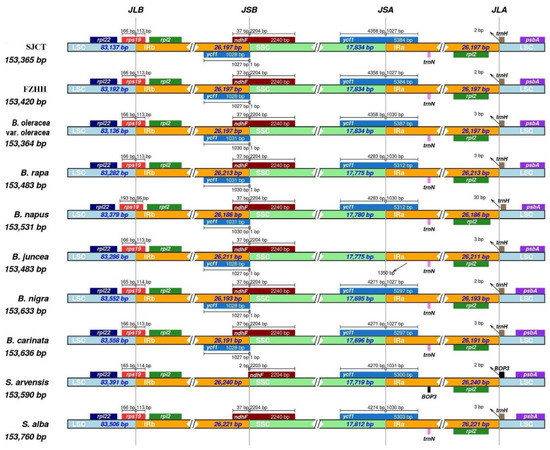 The expansion of IR and the variable SSC regions is considered the main mechanism underlying the length variation in angiosperm chloroplast genomes [25,26]. Generally, the genes at the LSC/IRb and SSC/IRa boundaries were rps19 and ycf1, respectively. The ycf1 gene of B. juncea was lost. These results are consistent with the findings in Brassica oleracea var. italic [27] and S. alba [28].