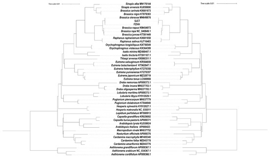 The topologies of the phylogenies constructed based on nucleotide and protein sequences were similar. Brassica was divided into two monophyletic clades. One clade was most closely related to S. alba. S. arvensis was most closely related to B. carinata rather than to S. alba. Another clade was closely related to Raphanus, and the two Chinese kale varieties were closely related to B. oleracea var. oleracea. B. napus, B. rapa, and B. juncea were most closely related in both trees (Figure 8).
