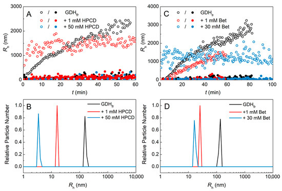The average hydrodynamic radii (Rh) of GDHfr aggregates at 25 °C after freeze–thawing in the presence of HPCD or Bet. (A,C) The time dependences of Rh in the absence or presence of different concentrations of HPCD or Bet, respectively. The open circles indicate the populations (1) of aggregates with higher impact on the light scattering intensity (I), the closed circles—populations (2) of aggregates with little effect on I. (B,D) The distribution of particle number on Rh of GDHfr in the absence and presence of HPCD or Bet, respectively, at 38 or 41 min after thawing.