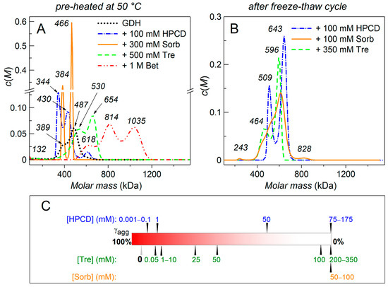 Figure 3B shows the c(M) mass distribution for GDH frozen in the presence of the chemical chaperones (350 mM of Tre, 100 mM of HPCD, 100 mM of Sorb). There is no control distribution for GDHfr without chaperones since almost all the protein precipitates after thawing (see a gray arrow in Figure 3C). All the chemical chaperones protected GDHfr from the precipitation (γagg = 0, Figure 3C) at the given concentrations. The c(M) distribution for GDHfr in the presence of 350 mM Tre revealed two maxima at 465 ± 31 kDa and 596 ± 26 kDa. In the presence of 100 mM HPCD the c(M) distribution revealed two peaks at 509 ± 21 kDa and 643 ± 27 kDa. GDHfr in the presence of 100 mM Sorb had a more polydisperse distribution in the mass range from 380 to 750 kDa and with small peaks at 828 kDa and 243 kDa. The polydispersity of the distributions indicates the presence of various oligomeric forms and conformational states of GDHfr. Thus, all the chemical chaperones preferably stabilized relatively small soluble GDHfr associates/aggregates.
