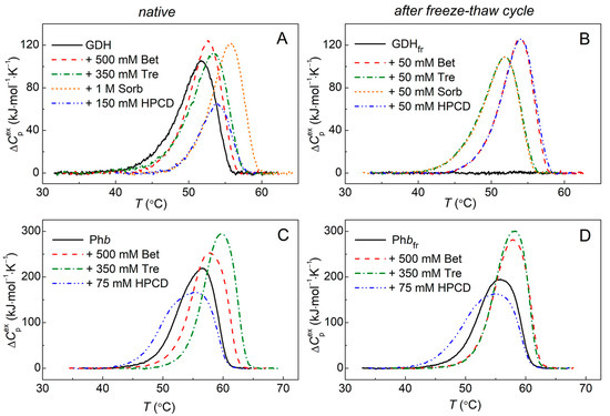 Previously, Kurganov suggested using the parameter [L]0.5 from the Hill equation as an estimation of the anti-aggregation activity of the chemical chaperones [40]. Judging from the [L]0.5 values (Table 1), HPCD and Tre appear to be the most effective during thermal aggregation of GDH, while HPCD and Bet—during the freeze–thaw cycle. The latter is supported by the DSC data, since the thermostability of GDHfr in the presence of Bet or HPCD is higher than in the presence of other cosolutes (Table 2).