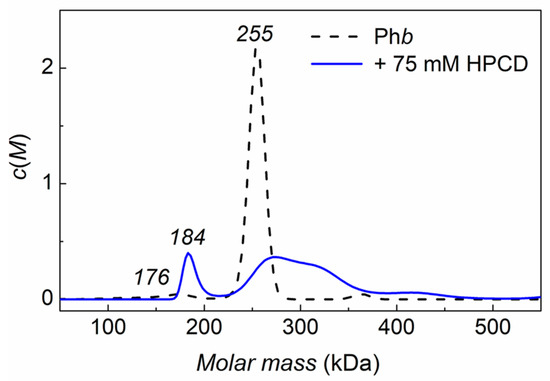 The c(M) distribution for Phb after 40 min heating at 48 °C followed by rapid cooling reveals the main peak at 255 ± 9 kDa and two minor peaks at 363 ± 8 kDa and 176 ± 15 kDa, which indicate the presence of a mixture of probably dimers and tetramers and small aggregates (Figure 5). The addition of 300 mM Tre stabilizes the dimeric form of Phb (197 kDa) (not shown since this coincides with our previously obtained data [36]). Tre can also stabilize denatured Phb monomers and small oligomeric aggregates and thereby inhibit the formation of large aggregates [36]. The c(M) distribution for the pre-heated mixture of Phb with 75mM HPCD shows one minor peak (184 ± 9 kDa) corresponding to the dimeric form of the protein, a major broad peak in the mass range of 220–382 kDa, and a small shoulder at 445 ± 30 kDa, which may correspond to the HPCD complex with a partially unfolded dimer and tetramer of Phb and small aggregates. The c(M) distribution of Phb heated in the presence of 300 mM Bet reveals the main peak at 489 kDa and two minor peaks at 383 and 592 kDa, indicating the presence of tetramers and relatively small aggregates of Phb in the solutions.