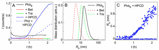 When studying the effect of freezing at –20 °C and subsequent thawing on Phb, it was shown that the protein forms aggregates. These aggregates are quite stable at 37 °C, judging by the DLS method. It can be seen from Figure 6A that the I value of the Phb solution after a freeze–thaw cycle does not change much. The mass particle size distribution after 2 h incubation at 37 °C is shown in Figure 6B (dotted curve). The Rh values for most of the particles present in the solution are in the range of 9–100 nm with the distribution maximum (Rh,max) at 14.6 ± 1.8 nm. A number of aggregates larger than 100 nm are also registered. It was shown that 38% of the protein can be precipitated during centrifugation, and the chemical chaperones (Bet, Tre, HPCD) diminish the amount of precipitated Phbfr (Table 3). The mass particle size distributions shift towards smaller radii and the Rh,max values equal 11.3 ± 1.6 nm and 5.8 ± 0.9 nm in the presence of Tre and Bet, respectively (Figure 6B). Despite a 3.5-fold decrease in the amount of Phbfr precipitated by centrifugation (cf. γagg values in Table 3), HPCD causes an increase in the size of aggregates formed in the Phbfr solution. It should be noted that Phb destabilization and aggregation enhancement in the presence of HPCD was observed earlier upon thermal aggregation of Phb [29]. Here, HPCD-induced aggregation/association of the intact Phb at the physiological temperature has been also observed (blue dashed curve in Figure 6A). This process accelerates for the frozen protein (blue solid curve in Figure 6A). As can be seen from Figure 6C, HPCD leads to the formation of large particles up to 1 μm after 2 h incubation at 37 °C. Nevertheless, a sufficient fraction of particles of a lesser size with approximate <Rh> = 4.5 ± 0.3 nm is also registered in the solution.