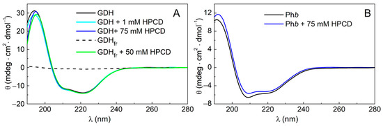 The comparison of CD spectra allows one to detect changes in the secondary structure of proteins and, therefore, their stability in the absence and presence of additives. The dual effect of HPCD on the aggregation and stability of the target proteins prompted us to investigate the effect of this compound on the secondary structure of GDH and Phb. The CD spectra of GDH and Phb in the absence and in the presence of HPCD are shown in Figure 7.