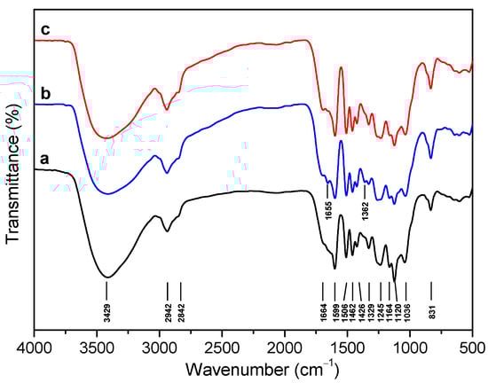 Figure 1 shows the FT-IR spectra of lignin extracted from three species of bamboo, which can identify the characteristic functional groups [33,34,35]. Obviously, the broad absorption band at 3429 cm−1 is associated with the OH stretching vibration. The bands at 1664 and 1655 cm−1 indicate the unconjugated carbonyl of the keto group and the carbonyl stretch of the conjugated carbonate, respectively. The peaks at 1599, 1511, and 1426 cm−1 correspond to aromatic backbone vibrations and C-H deformations, and the methoxy group at 1460 cm−1 is the asymmetric C-H vibration. The analysis of the spectra of the three lignins demonstrated that the aromatic skeleton of the lignin structure was kept well during the isolation process [12]. Syringyl and condensed guaiacyl absorb the band at 1239 cm−1, and the fused G-unit with the C–O stretching at 1253 cm−1 [58,59,60]. The 1125 and 834 cm−1 peaks dominate as unambiguous signals for HGS lignin, which proves that the three bamboo lignins exhibit the pattern of typical grass lignin.