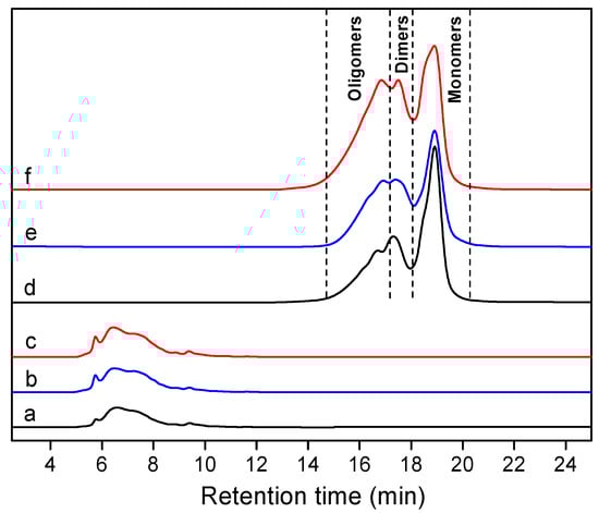 GPC of (a) CELN, (b) CELB, (c) CELD and lignin oil obtained from the catalytic hydrogenolysis of (d) CELN, (e) CELB, (f) CELD over a Ru@NC catalyst.