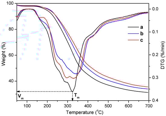 TG and DTG curves of (a) CELN, (b) CELB, and (c) CELD.
