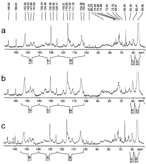 The 13C NMR spectroscopy provides valid evidence for the analysis of the chemical structure of bamboo lignin [41,42,43]. As shown in Figure 4, the peaks of S-type were identified by signals at 151.1–155.1 ppm (C-3/C-5 etherified and condensed), 146.6–148.7 ppm (C-3/C-5 non-etherified), 138.1 ppm (C-4 etherified), 133.0–136.6 ppm (C-1), and 102.5–106.5 ppm (C-2/C-6). The G-units give signals at 148.7–151.0 ppm (C-3 etherified and condensed), 146.6–148.7 ppm (C-4 etherified), 144.0–146.6 ppm (C-3/C-4 non-etherified), 133.0–136.6 ppm (C-1), 119.5 ppm (C-6), 113.1–118.0 ppm (C-5), and 110.0–113.1 ppm (C-2). The H units were detected at 128.1 ppm (C-2/C-6), and 113.1–118.0 ppm (C-3/C-5). Moreover, the pCA was evidenced by five signals at 166.7, 160.1, 130.5, 125.3, and 113.1–118 ppm, which originated from C-9, C-4, C-2/C-6, C-3/C-5, and C-β in the structures, respectively. Additionally, we assigned the above spectral regions to functional groups and quantified them by integration (Table S1). The analysis results of quantitative 13C NMR spectroscopy further revealed that the bamboo CEL was a typical HGS-type lignin, which was in good accordance with the aforementioned results of FT-IR.