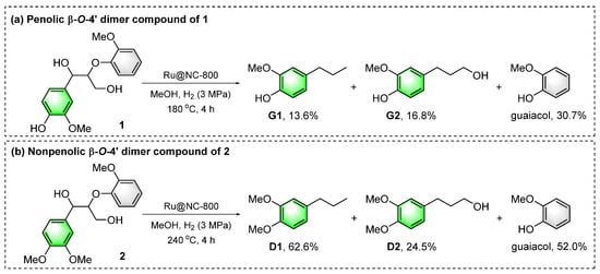 To further understand the pathway of lignin during the Ru@NC-catalyzed hydrogenolysis reactions, the typical lignin β-O-4′ model compounds were tested (Figure 7) [76,77]. Catalytic hydrogenolysis of phenolic β-O-4′ dimer 1 offered G1 (13.6%) and G2 (16.8%) as the major phenolic monomer products (reaction a, Figure S6). Nonphenolic β-O-4′ dimer 2 could efficiently afford 4-propylveratrole (D1) and benzenepropanol (D2) in 62.6% and 24.5% yields, respectively (reaction b, Figure S7). All the product distributions were similar to those of the Ru@NC-catalyzed hydrogenolysis of CEL samples. These results further confirmed that Ru@NC displayed excellent activity for the hydrogenation of C=C/C=O bonds and hydrogenolysis of C–O bonds in β-O-4′ moieties.