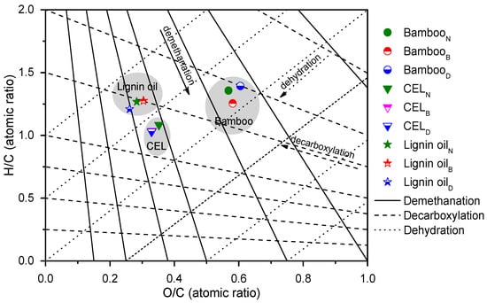 The elemental compositions of the three bamboo species, CELs, and the corresponding lignin oily products were investigated, which is summarized in Table S4 and depicted in Figure 8 as the van Krevelen diagram [32,78]. The solid, dashed, and dotted lines in the diagram represent the processes of demethanation, decarboxylation, and dehydration reactions, respectively. Notably, the H/C ratio of BambooB was slightly lower than that of the other two bamboo samples (BambooN and BambooD) because of the lower content of carbohydrates, which was consistent with the compositional analysis results in Table 1. It was found that the average H/C molar ratios of lignin oil were significantly higher than those of CELs. This was reasonable as (hemi)celluloses were removed in the preparation of CEL samples, which was further verified by the O/C ratios between bamboo and CEL samples. Moreover, it was found that the average O/C molar ratio of lignin oil products (0.26~0.30) was close to those of CEL samples (0.33~0.35) but much lower than those of bamboo materials (0.57~0.61). The results of reduced oxygen content but increased hydrogen content further indicated the efficient C–O bond scission in the catalytic hydrogenolysis of lignin, which led to deoxygenation and decarboxylation process.