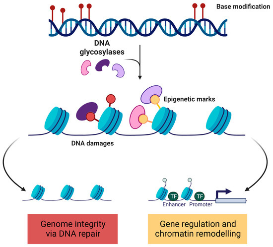 DNA glycosylases act as DNA sensors for discriminating between DNA damages and epigenetic marks. The same chemical modification can act as DNA damage or epigenetic modification. DNA glycosylases need to discriminate the nature of these modifications in order to restore genome integrity via DNA repair or to regulate gene expression and chromatin remodelling. The figure has been generated using Biorender.com.