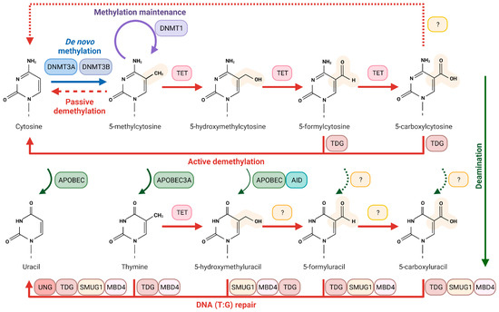 Methylation levels are dynamically controlled through active and passive DNA demethylation processes. In addition to passive demethylation, where these modified bases are diluted through replication, three mechanisms have been proposed for active demethylation. Two of them rely on TDG (thymine DNA glycosylase) and SMUG1 (single-stranded selective monofunctional uracil DNA glycosylase) for the recognition of the oxidized cytosines and on BER for the restoration of the unmodified base. TDG recognizes and removes both 5-fC and 5-caC. This excision generates an AP site that is repaired by BER restoring an unmodified cytosine. The second mechanism suggests a direct deamination of 5-hmC to 5-hmU by AID and APOBEC family proteins. The result base, 5-hmU, is then recognized by TDG or SMUG1 and finally repaired by BER [51]. Although deamination from 5-hmC to 5-hmU does occur in cells under special conditions [47], this mechanism is still debated, due to AID’s preference for single-stranded DNA and missing evidence that APOBEC enzymes deaminate 5-hmC in vivo [52,53]. Thus, 5-hmC-dependent deamination under specific conditions cannot be excluded, but it is likely not the main mechanism for the formation of 5-hmU. The last mechanism proposes a direct conversion from 5-caC to cytosine by a putative, yet to be identified decarboxylase [29,30,47,48,54,55,56,57,58] (Figure 2).