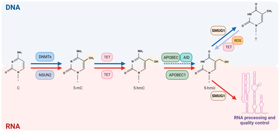 Interestingly, the same TET enzymes involved in 5-mC demethylation on DNA are responsible for both mediating the reversal of 5-mC on RNA by functioning as RNA demethylases [89,93] and specifically oxidating 5-mC to 5-hmC [89,94]. The RNA 5-hmC mark has been associated with controlling the transcriptional landscape in embryonic stem cells (ESCs), where it regulates pluripotency and lineage-priming mRNAs for a proper differentiation and cell state transition [73,95,96]. It regulates mRNA half-life and splicing [73]. 5-hmC can be further deaminated by APOBEC to form 5-hmU, which has a role in RNA quality control [64,97,98,99].