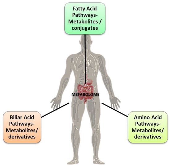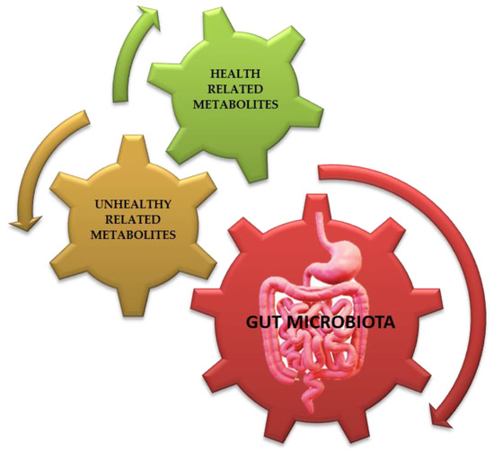 The microbiota is a complex, interconnected bio-system of microorganisms in the human body whose activities vary according to the interaction between the microbial components and the different organs of the host. The widest microorganism population, the gut microbiota, is connected to various cross-talking microbial axes such as the gut/lung, gut/brain, gut/skin, and bladder/gut/brain axes [1]. Since ancient times, physicians such as Hippocrates and, later, Galen recognized that “maldigestion is the root of all suffering”, noting that “all diseases originate in the intestine” and taking advantage of available treatments such as herbal infusions to smooth diseases symptoms [2,3]. The microorganisms inhabiting our gut exceed 1014, with our microbiota possessing 100 times more genes than our own genome, and a total weight of approximately 1–2 kg (close to the weight of our brain) [4,5,6]. In light of this background, the emerging field of metabolomics may expand our current knowledge on diseases pathophysiology and help to develop a “personalized therapy” for each patient [7]. Metabolomics is the systematic study of the unique chemical “fingerprints” left by specific cellular processes which involve metabolites, small molecules, and intermediate and/or end products of cellular metabolism, including those derived from the intestinal microbiota (Figure 1) [8].