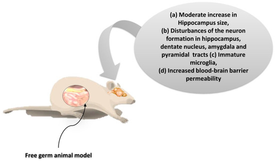 As suggested by the findings listed above, microbiota dysbiosis is causally related to the consequences not only on the homeostasis of the gastrointestinal tract, but also in other organs. Particularly interesting is the potential link of microbiota with the activities in the CNS. Indeed, many current studies seek the bidirectional correlation of intestinal dysbiosis with higher cognitive functions under intense stress and mental illness (such as depression status) [5,81]. A correlation seems plausible with severe developmental disorders such as autism [41]. Based on these observations, a balanced development of the intestinal microbiota seems to play a crucial role not only in the development of both the intestinal and CN systems, but also in the regulation of their communication [102]. Experimental studies on germ-free (GF) animal models show that the inhibition of colonization by microorganisms strongly influences the expression and function of neuroregulatory substances both in the CNS and ENS, resulting in a dysfunctional gut/brain axis. In the context of this dysfunction, a reduction in the kinetics and sensory activity of the gastrointestinal tract, as well as neuromuscular dysfunction, are observed (Figure 6) [103].
