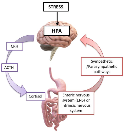 The brain plays a key role in the gastrointestinal tract as it modulates, independently and in parallel with the ENS, the motility of the gastrointestinal tract, the secretion of gastric fluid and mucus, and the related immune responses [121,122]. Given its bidirectional interaction, the gut/brain axis, through stimuli (i.e., stressors), influences the composition and balance of the intestinal microbiota. It has been recurrently observed that short-term stressful stimuli can affect certain microbial portions of the gut microbiota via the afferent neural pathways of the ENS. Dissimilar stressors have different effects on the intestinal mucosa [123] and may modify the secreted mucus both in the quantity and quality of its composition. The long-term stress of daily life is the culprit of intense quality changes in the balance of the intestinal microbiota and subsequent gastrointestinal dysfunction [1,124]. This influence is mediated by the secretion of specific signaling molecules of CNS neurons and by the activation of immune cells. Thus, the effect of the CNS on the composition of the intestinal microbiota largely depends on the presence of specific receptors and neuro-regulatory substances on the surface of the bacteria [1,112,125]. Finally, as already mentioned, continuous stress in the gastrointestinal tract enhances permeability and reduces the protective shield of the intestinal barrier. Greater permeability allows for the entry of pathogenic and bacterial antigens, causing subsequent immune responses that impair, even further, the intestinal microbiota (Figure 7) [2,6].