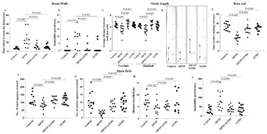 Motor function tests were performed for all the experimental mice. Beam walk and rotarod tests were studied 48 h after the last MPTP injection, and open-field locomotor and stride length were measured, on the next day. The values obtained from each test were collected and the differences between the groups were analyzed using one-way ANOVA followed by Tukey’s multiple comparison method as the post hoc test. Statistical results showing the impact of LFMS treatment (see Figure 1 for details) on the motor function of MPTP-treated mice are summarized in the next four sections.