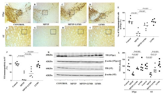 Effect of LFMS on tyrosine hydroxylase (TH) levels in the SNpc and ST regions of MPTP mice brain. Representative images of TH immunopositive cells in SNpc (A–D; at 4× magnification) and ST ((F–I); at 10× magnification) regions of control (A,F), MPTP (B,G), MPTP + LFMS (C,H), and LFMS alone (D,I) treated mice brain; boxes on the images indicate the regions where quantification was performed; (E) graph representing the percentage number of TH immunopositive cells in the SNpc region; and (J) TH immunopositivity in the ST region. (K) Representative Western blot images of TH levels and their respective loading control in the SNpc and ST regions of control, MPTP, MPTP + LFMS, and LFMS mice brain; and (L) graph representing the % levels of TH via Western blotting, n = 6.