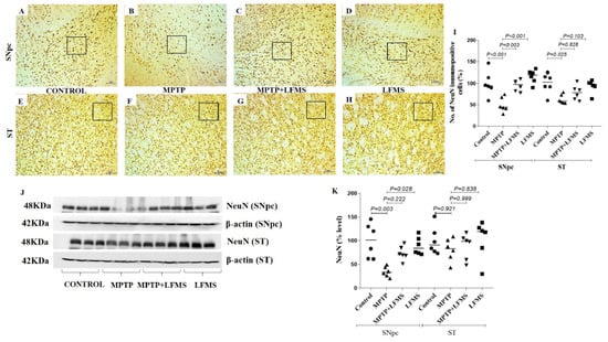 Effect of LFMS on neuronal nuclei (NeuN) levels in the SNpc and ST regions of MPTP-induced mice. Representative images of NeuN immunopositive cells in SNpc (A–D; at 4× magnification) and ST (E–H; at 10× magnification) regions of control (A,E), MPTP (B,F), MPTP + LFMS (C,G), and LFMS alone (D,H) treated mice brain; boxes on the images indicate the region where quantification was performed; and (I) graph representing the percentage number of NeuN immunopositive cells in the SNpc and ST regions. (J) Representative Western blot images of NeuN level and their respective loading control in the SNpc and ST regions of control, MPTP, MPTP + LFMS, and LFMS mice brain; and (K) graph representing the levels of NeuN via Western blotting, n = 6.