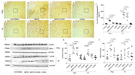 Effect of LFMS on glial fibrillary acidic protein (GFAP) level in the SNpc and ST regions of MPTP-induced mice. Representative images of GFAP immunopositive cells in SNpc (A–D) and ST (E–H) regions (at 40× and 100× magnification, respectively) of control (A,E), MPTP (B,F), MPTP + LFMS (C,G), and LFMS alone (D,H) treated mice brain; boxes on the images indicate the region where quantification was performed; and (I) graph representing the percentage number of GFAP immunopositive cells in the SNpc and ST regions. (J) Representative Western blot images of the GFAP and IBA1 levels and their respective loading control in the SNpc and ST regions of the control, MPTP, MPTP + LFMS, and LFMS mice brain. The graph represents the levels of GFAP (K) and IBA1 (L) via Western blotting, n = 6.