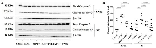 The data collected from the Western blot images of total and cleaved caspase 3 (represented in Figure 6A) were analyzed using two-way ANOVA (Figure 6B). A significant increase in cleaved-to-total caspase-3 ratio was observed in the SNpc and ST regions of the MPTP mice (p < 0.001 and p = 0.01, respectively) compared with those in the control mice. While LFMS treatment insignificantly decreased the caspase-3 ratio in SNpc (p = 0.055), it had no effect in the ST regions (p = 0.187). LFMS treatment of the control mice showed no effects on caspase 3 when compared with the untreated control mice (p = 0.999). The two-way ANOVA analysis was performed for the cleaved-to-total caspase-3 ratios and the F value between the groups was found to be F (3, 40) = 17.08; n = 6; p < 0.001. The interaction between the SNpc and ST regions was F (3, 40) = 0.376; n = 6; p = 0.771.