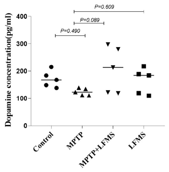 The dopamine level in the ST region of the experimental mouse brain was analyzed using the ELISA technique and the differences between the groups were analyzed using one-way ANOVA. The dopamine level reduction in the MPTP mouse brains was not significant when compared with that of the control brains (p = 0.490). LFMS treatment appeared to increase the dopamine level in the ST region in comparison with the MPTP-treated mouse brain; however, it did not reach a significant level (p = 0.089). The mice brain treated with LFMS alone were comparable to that of the normal control mouse brain (p = 0.997). No significant differences between the groups were observed in the one-way ANOVA analysis (F (3, 16) = 2.189; n = 5; p = 0.129) (Figure 7).