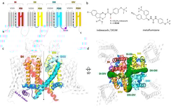 Figure 1. (a) Topology of the pseudotetrameric α-subunit of the mosquito Anopheles gambiae voltage-gated sodium channel shows four domains consisting of six transmembrane helices each (S1–S6). Helices 1–4 contribute to the voltage-sensor domain (VSD, gray), with a positively charged S4 helix acting as a voltage sensor, and helices S5–S6 create the pore domain (PD). The S4–S5 linkers are shown in dark blue. The inactivation gate MFM motif, as a part of the DIII-DIV linker, is marked in violet. (b) Structures of sodium channel blocker insecticides: indoxacarb/DCJW (left) and metaflumizone (right). (c) Homology model of the mosquito channel based on the inactivated-state structure of the hNav1.7 channel (PDB code: 6J8G [11]). The approximate location of the pore is indicated by the dashed line. (d) The side (left) and top (right) view of the channel with the four lateral fenestrations found by MOLE are shown in green.