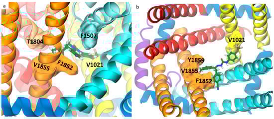 Substitution of V1021 did not affect DCJW binding significantly—RMSD values for a ligand shifted by 0.16 Å and 1.0 Å for isoleucine and glycine, respectively, which are kdr mutations found in nature. Only the lysine substitution pulled the trifluoromethyl group of DCJW out of the CC entrance to the DII-DIII fenestration (RMSD = 2.28 Å), reducing the binding affinity by 0.55 kcal/mol (Table 2). A higher effect was observed for metaflumizone. While isoleucine and glycine substitutions only slightly shifted the ligand positions (RMSD ~1.7 Å), in the V1021K substituted channel WT-like binding poses were not found. Our results are in agreement with the previous mutagenesis study on the rNav1.4 channel, where sensitivity to inhibition by 10 µM metaflumizone was abolished entirely in the rNav1.4/V787K channels, but no significant effect was observed for DCJW [39]. V1021K substitution disabled etofenprox binding deep into the DII-DIII fenestration. In this mutant, we obtained a binding pose similar to that presented before [54], with the SSF reduced by 1.7 kcal/mol when compared to the WT (Figure S7 in the Supplementary Materials).