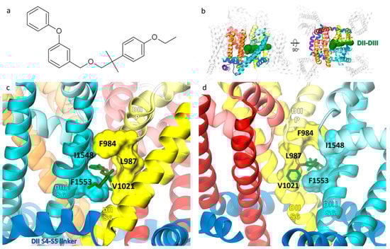 Figure 4. (a) Chemical structure of non-ester pyrethroid insecticide etofenprox. (b) The DII-DIII fenestration tunnel, found in docking as a ligand binding region, is presented in green in a voltage-gated sodium channel model in a side (left) and a top (right) view. (c,d) The lowest energy pose of etofenprox (in green stick representation) bound in the open model. View from the channel/membrane interface is shown in (c), while the fenestration entrance to the central cavity of the channel is visualized in (d), with the PDIII helices removed for clarity. Residues that were found as kdr contributing to both etofenprox and SCBIs binding are shown in a surface representation. The coloring of the channel refers to Figure 1.
