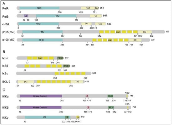 The core members of the NF-κB signaling pathway [22]. (A) The protein structure of the core member of the NF-κB signaling; (B) the protein structure of the core member of the IκB family; (C) the protein structure of the core member of the IκB kinase (IKK) complex. Further abbreviations: N-terminal Rel homology domain (RHD); ankyrin (ANK); C-terminal transactivation domains (TAs); leucine zipper-like motif (LZ); death domain (DD); helix–loop–helix domain (HLH); coiled-coil domain (CC); NEMO-binding domain (NBD); zinc finger domain (ZF).